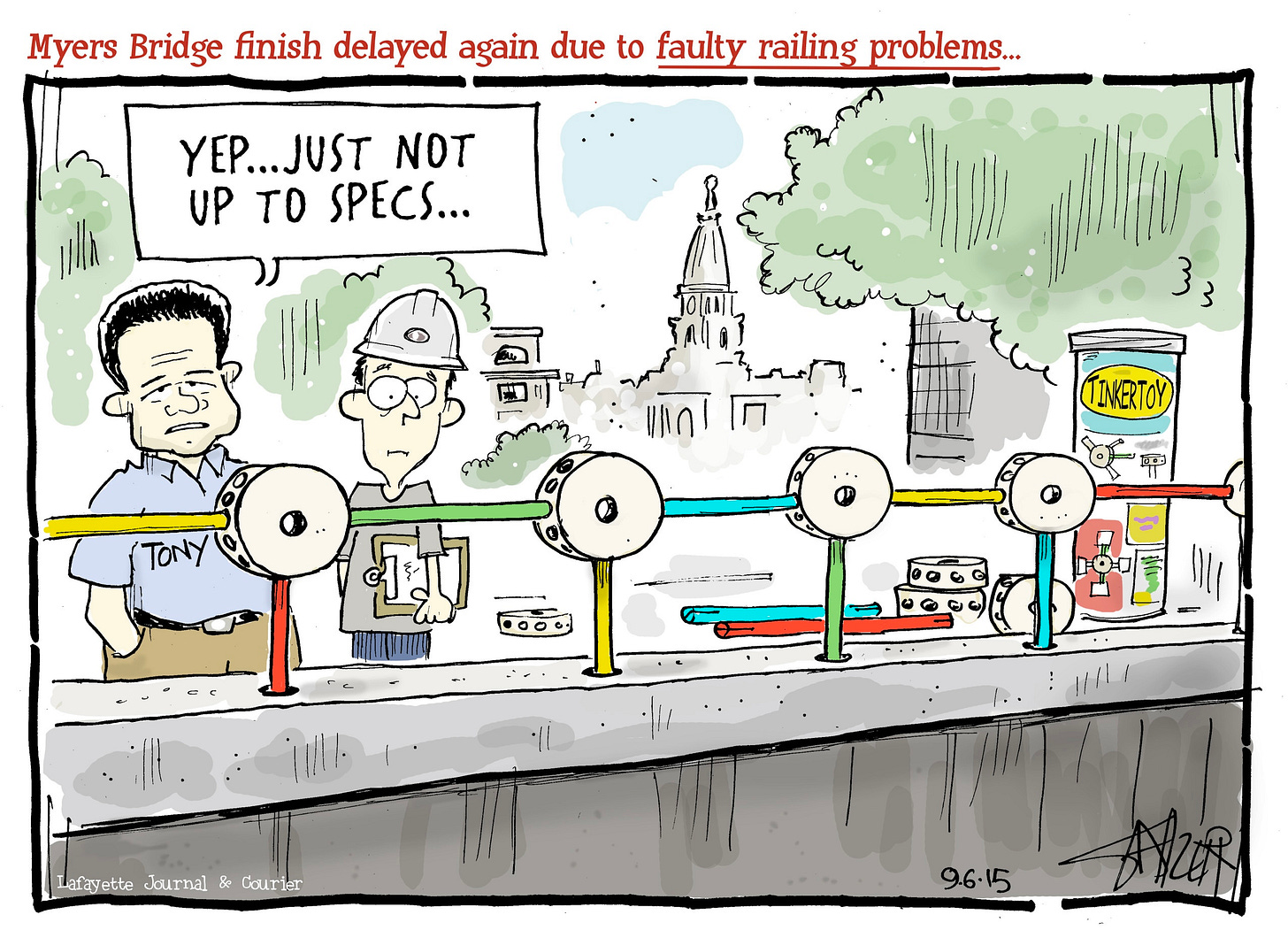 Out of the 2015 J&C Archives 0n Sept 6, 2015, Lafayette was finishing the newly renovated Myers pedestrian bridge when they realized the new bridge railings ordered were poorly made and not up to the city’s standards.Dave Sattler - cartoonistSep 07, 2022195Share